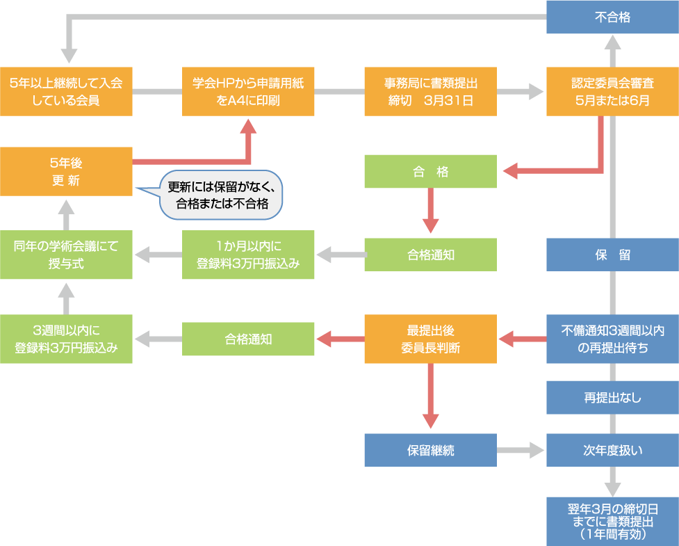 更新申請者・終身希望者・終身確認者(申請書類は、末尾の様式一覧からA4用紙に印刷すること。不明なことは本学会事務局へ文書にて問い合せること)→ 本学会事務局へ書留郵便にて申請書類(のコピーを認定委員会審査終了まで本人保管) の送付(令和8(2026年3月31日までに)→事務局にて書類のまとめ(申請書類、その他提出書類の一覧作成)→認定委員会において申請者の認定判定作業(令和8(2026)年6月末日までに)